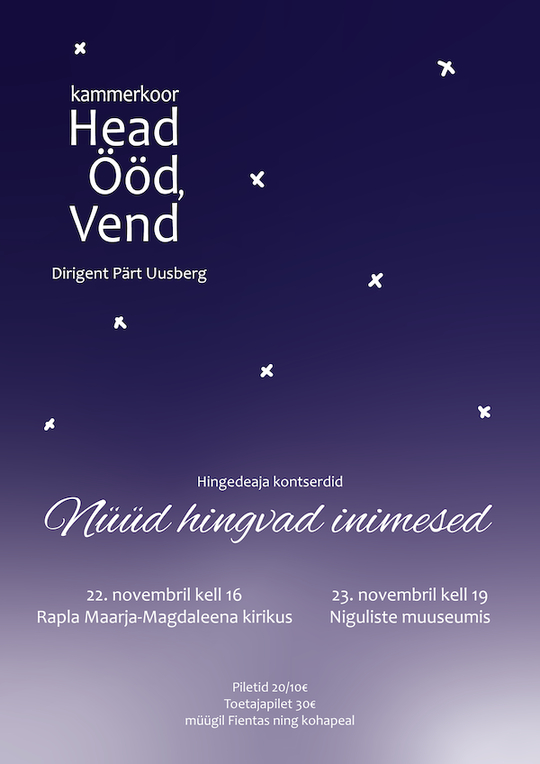 Oled oodatud Kammerkoori Head Ööd, Vend traditsioonilisele hingedeaja kontserdile 8. novembril kell 19 Tallinna Jaani kirikus ja 9. novembril kell 16 Rapla Maarja-Magdaleena kirikus.